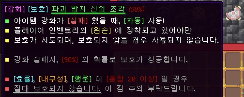 해당 아이템으로 효율, 내구성, 행운이 20만 넘지 않는다면 높은 확률로 강화를 실패했을 때 아이템 파괴가 방지됩니다! (파괴 방지 아이템은 소멸)